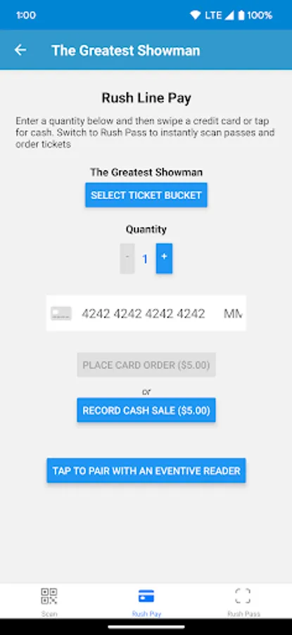 - Rush Line ticket sales using Eventive Reader (credit card reader; separate hardware required)