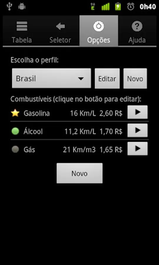 It is also possible to register different fuels or sources and even different profiles, in order to use Gas-o-eta with any of your vehicles, in any region.
