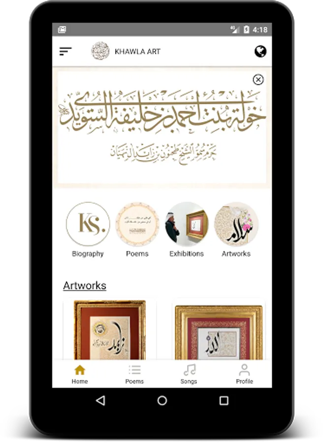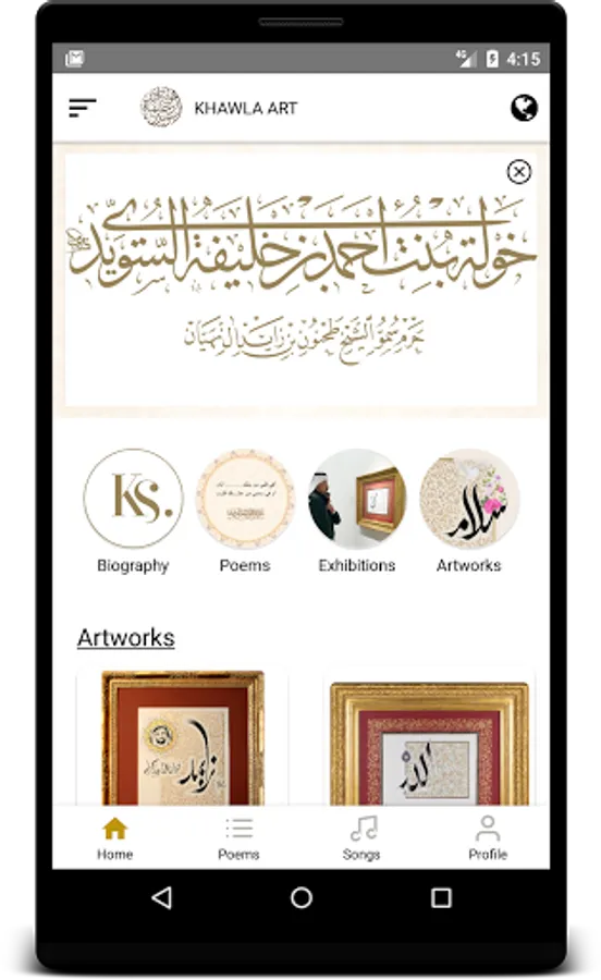 H.H. Sheikha Khawla bint Ahmed bin Khalifa Al Suwaidi;the wife of H.H. Sheikh Tahnoon bin Zayed Al Nahyan, The UAE’s National Security Advisor; is a poet, a woman of letters,a renowned calligrapher and an art and literature critic. She sponsors and promotes creativity and artistic work. The app showcases her works and arts and gives notifications for the exhibitions and events organized by her. The app is updated with new artworks ,articles , poems , songs and events every week.