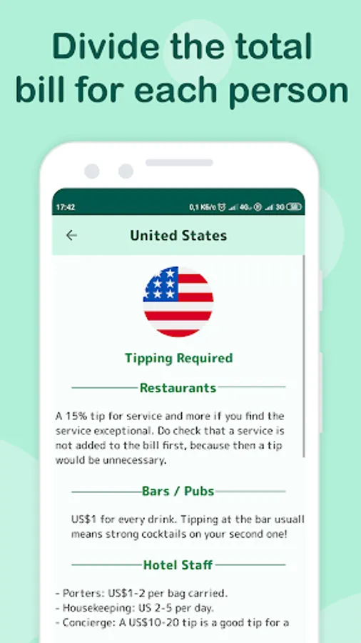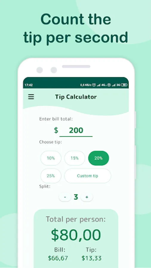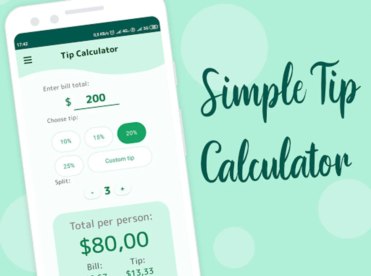 This tip calculator app not only calculates tip quickly and easily but also helps to split the bill between any number of people. Round up or round down on any value on the tip calculator.See changes to the tip percentage, tip amount, total amount and amount payable per person immediately!
