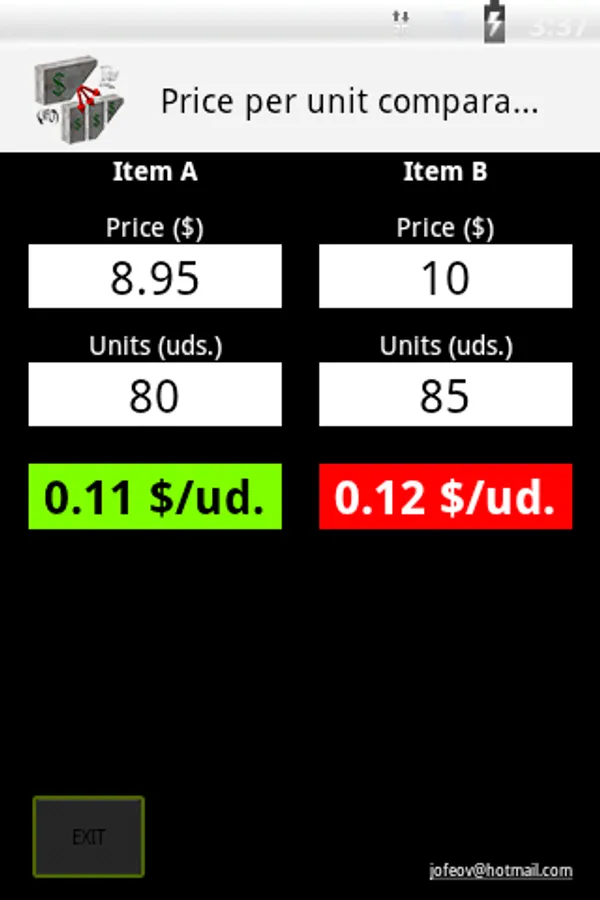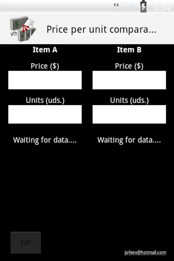This application is used to save money in the shopping cart. Compare unit prices between 2 items.