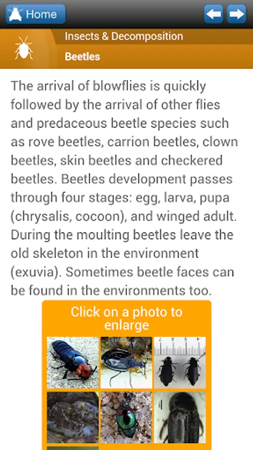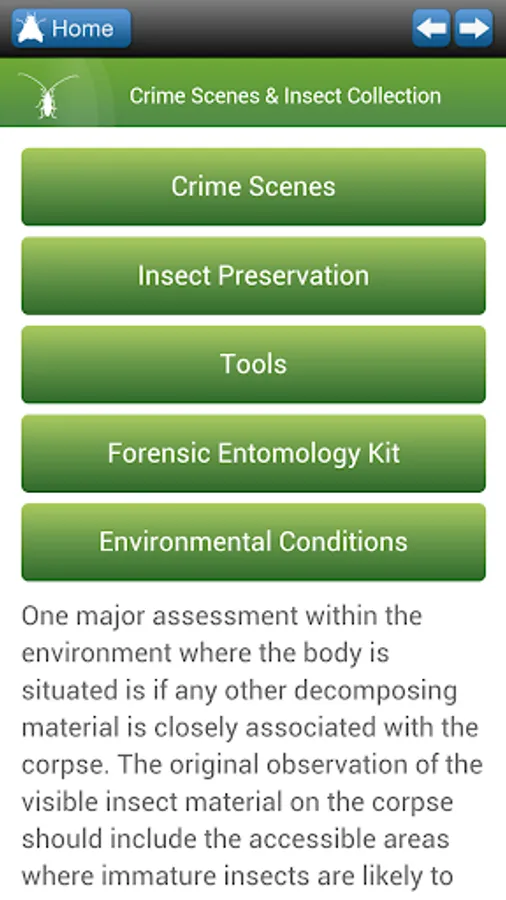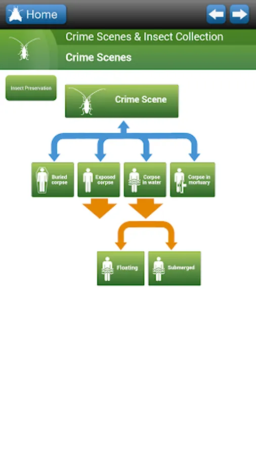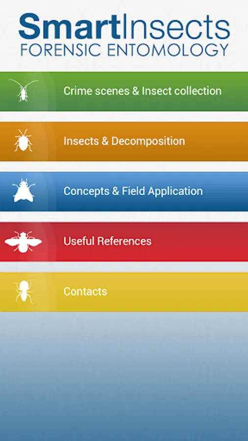 SmartInsects is divided in sections such as: general concepts, insect pictures, guidelines for sampling and storage of insect material and collection of environmental data. Moreover, useful references and contacts are provided. This app is purely designed to guide the crime scene technician or proxy for collecting and preserving entomological samples. App updates with translation into different languages will be become available after further input from the entomological community.