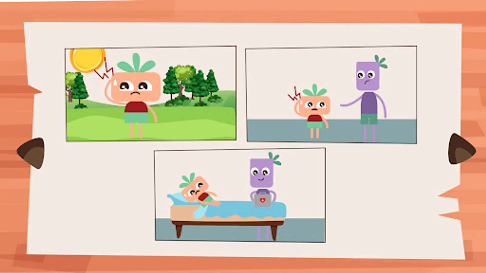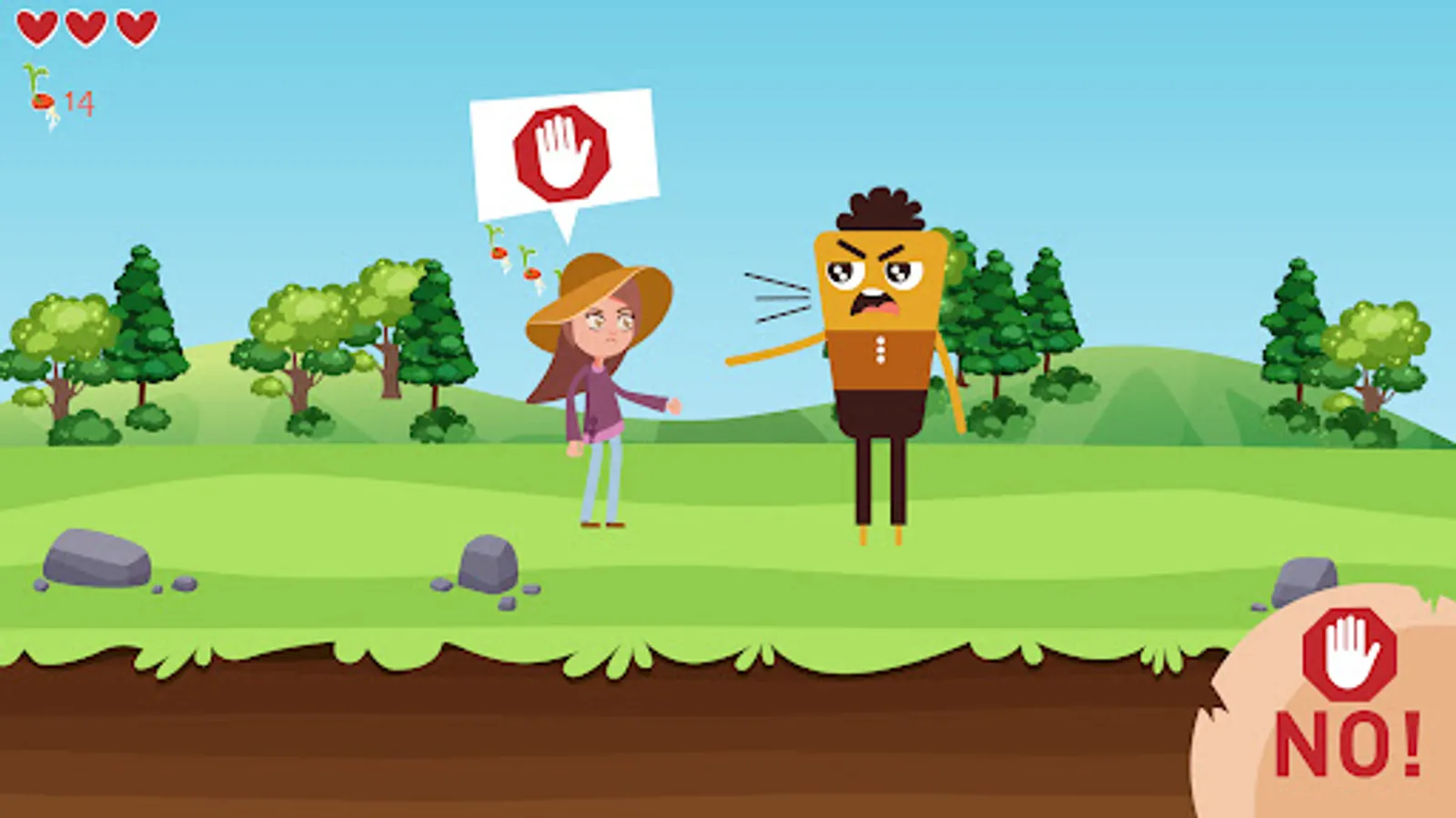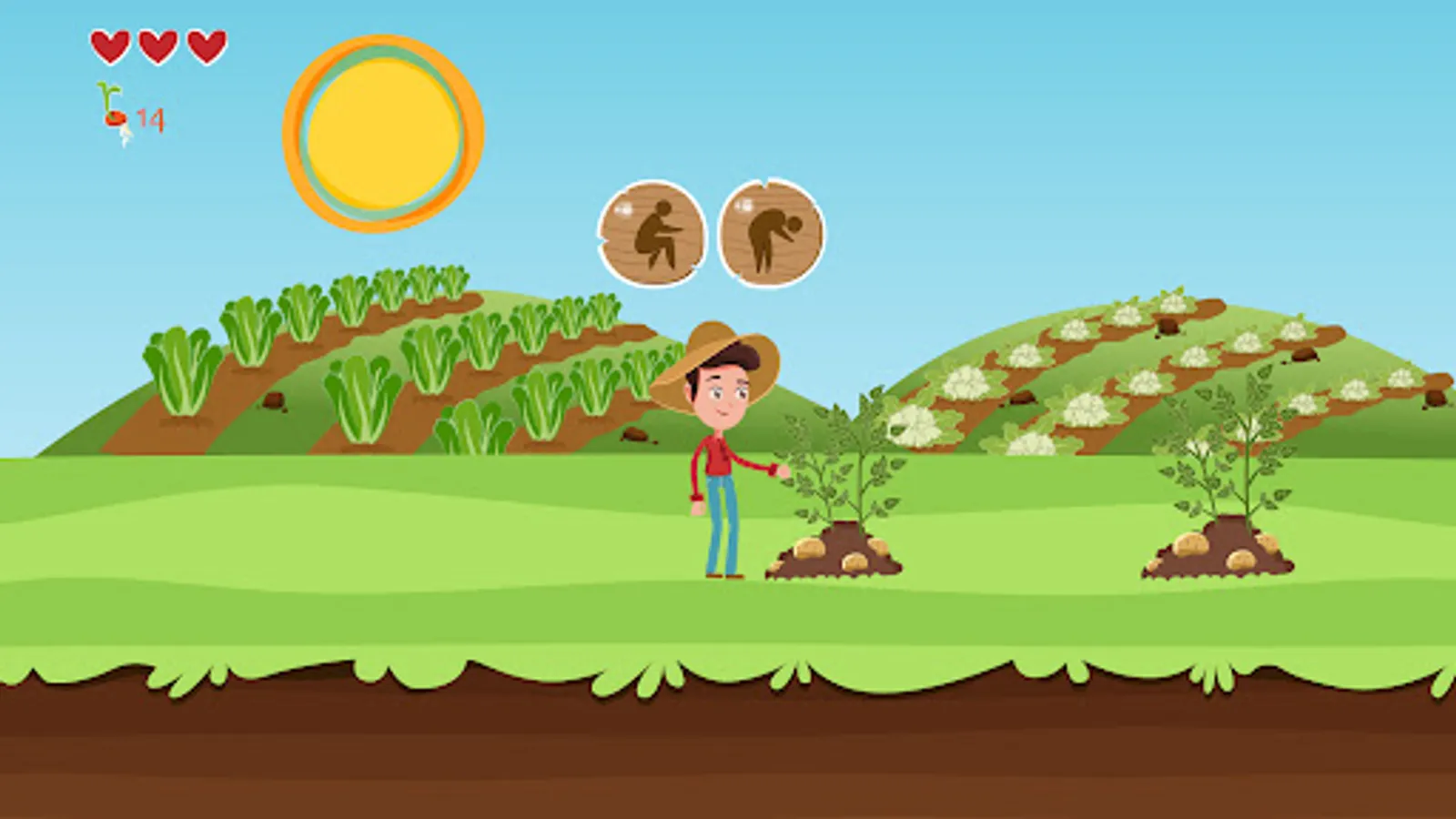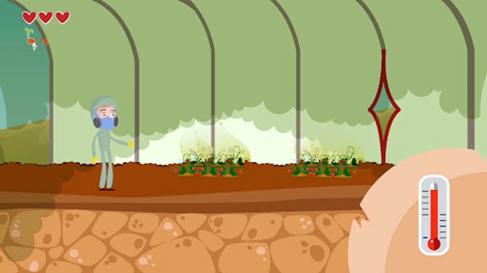 Throughout the levels, the game character will face a wide range of sector-related risks, including weather (sun, cold, rain), pollution, animal bites/stings, chemicals (greenhouses, pesticides), loads, sharp tools and to introduce some protectives measures. In order to win the levels, the player must choose the correct prevention and protective measures to avoid physical, chemical and psychological hazards in agriculture.