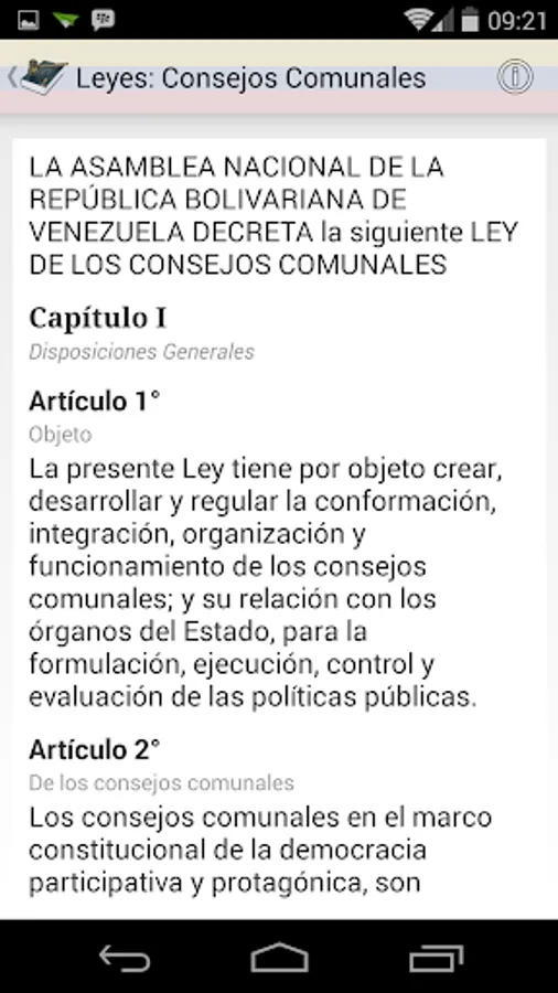 Application specially designed to have and consult the Special Law of Communal Councils belonging to the Bolivarian Republic of Venezuela, quickly, easily and intuitively. It is suitable for everyone, not limited to the law student or lawyer, the judge, etc..