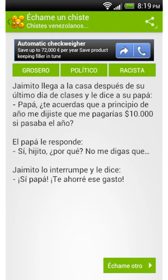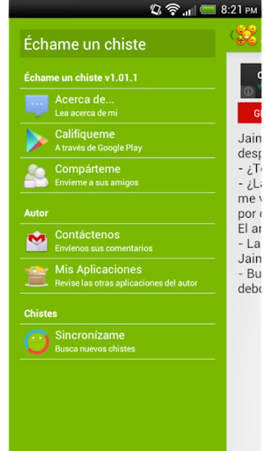 It also has the ability to playback audio jokes (if no audio is played back, make sure you have installed speech synthesis libraries as SpeechSynthesis SPA-ESP Voice Android TextToSpeech).