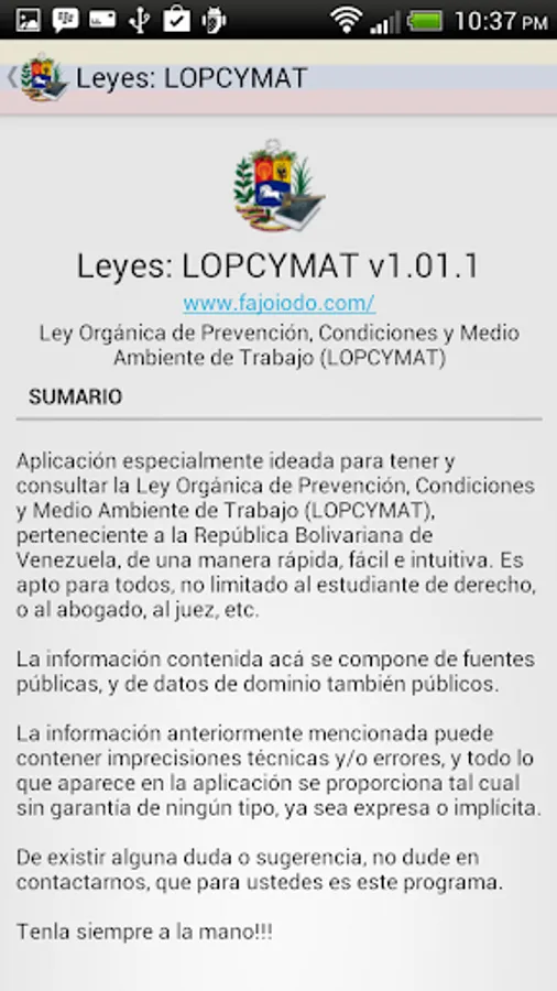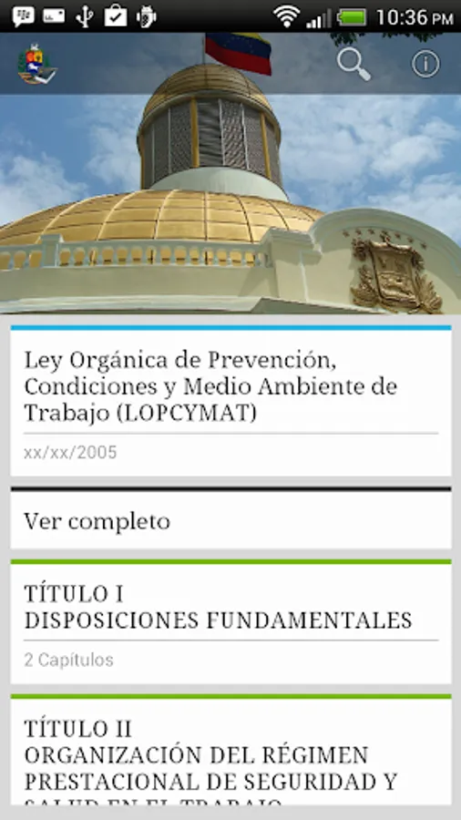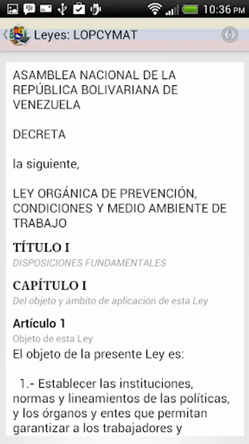 Application specially designed to have and consult the Organic Law of Prevention, Conditions and Environment (LOPCYMAT) belonging to the Bolivarian Republic of Venezuela, quickly, easily and intuitively. It is suitable for everyone, not limited to law student or lawyer, the judge, etc.