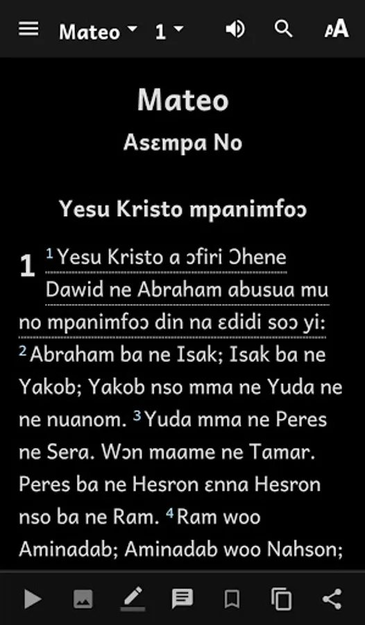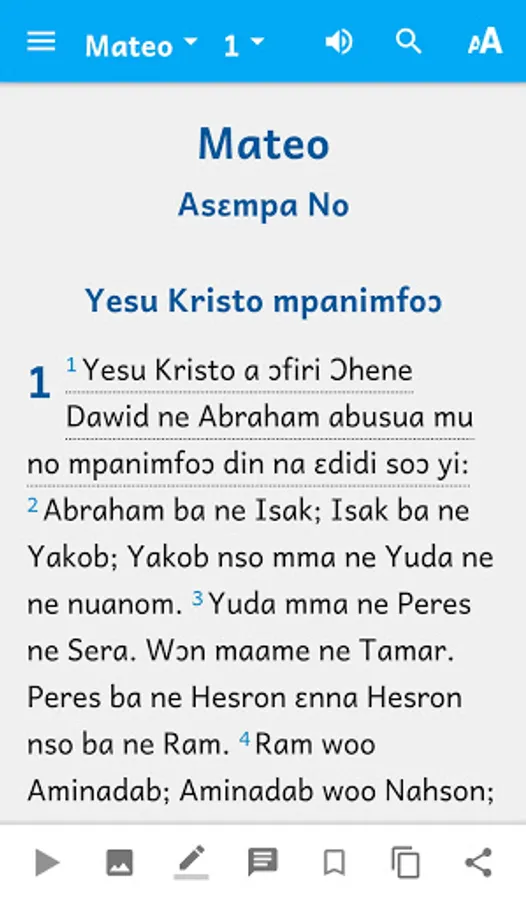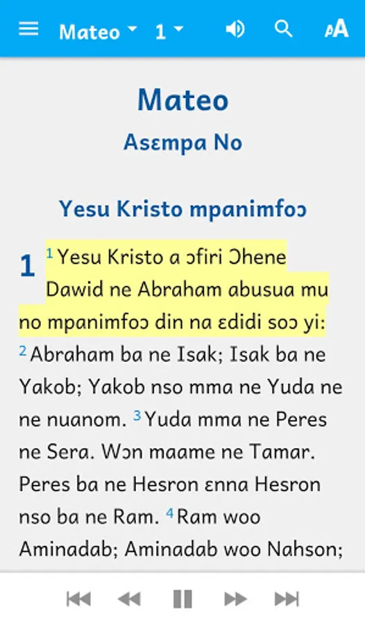 Read, listen and meditate on the Word of God in Akan Asante using our free Bible app. This Bible app supports almost all Android devices, so it is easy for you to download and use, at no cost to you. The Akan Asante Audio Bible has been integrated into our app so when you would like to listen to the audio, just press the "Speaker" icon from the app's menu bar. The audio has been synchronized with the text and highlights each verse like karaoke when you push play. You can also start listening anywhere within a chapter by tapping on the verse you want to hear.