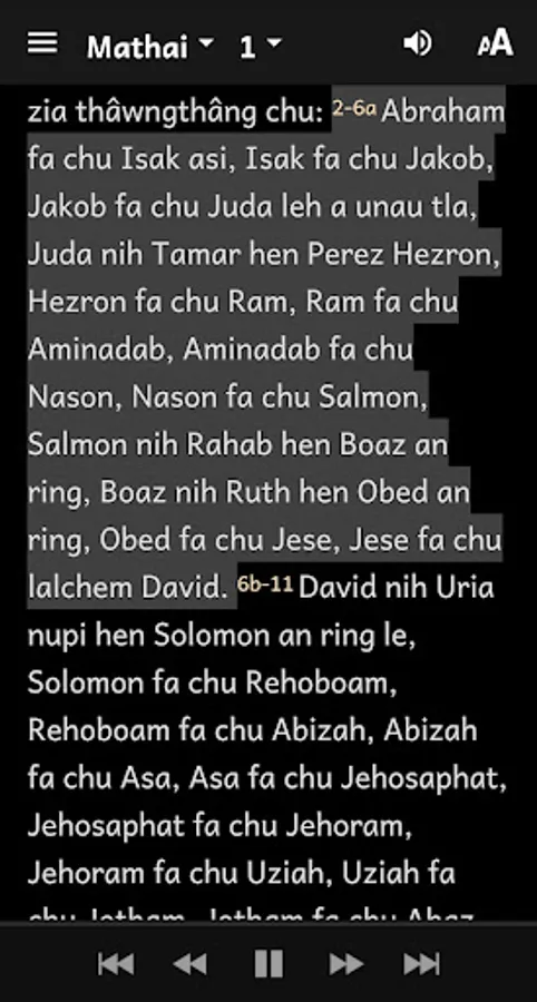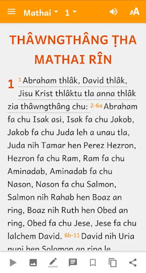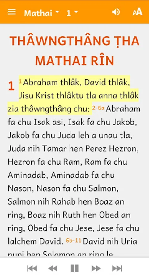 Read, listen and meditate on the Word of God in Bawm using our free Bible app. It is easy for you to download and use, at no cost to you. The Bawm Audio Bible by Faith Comes By Hearing has been integrated into our app so when you would like to listen to the audio, just press the "Speaker" icon from the app's menu bar. The audio has been synchronized with the text and highlights each verse like karaoke when you push play. You can also start listening anywhere within a chapter by tapping on the verse you want to hear.