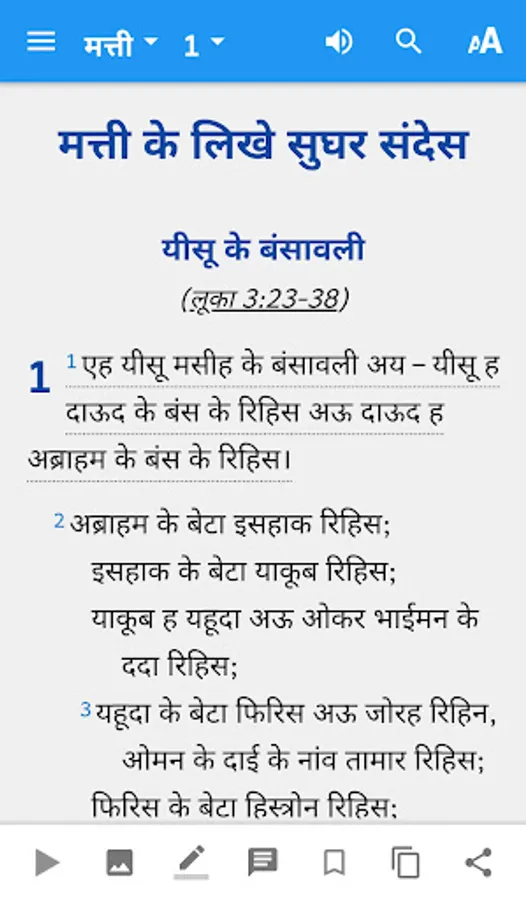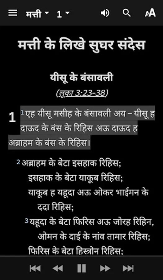 Read, listen and meditate on the Word of God in Chhattisgarhi using our free Bible app. It is easy for you to download and use, at no cost to you. The Chhattisgarhi Audio Bible by Faith Comes By Hearing has been integrated into our app so when you would like to listen to the audio, just press the "Speaker" icon from the app's menu bar. The audio has been synchronized with the text and highlights each verse like karaoke when you push play. You can also start listening anywhere within a chapter by tapping on the verse you want to hear.