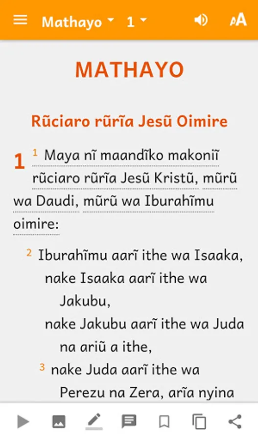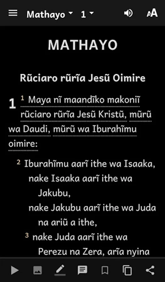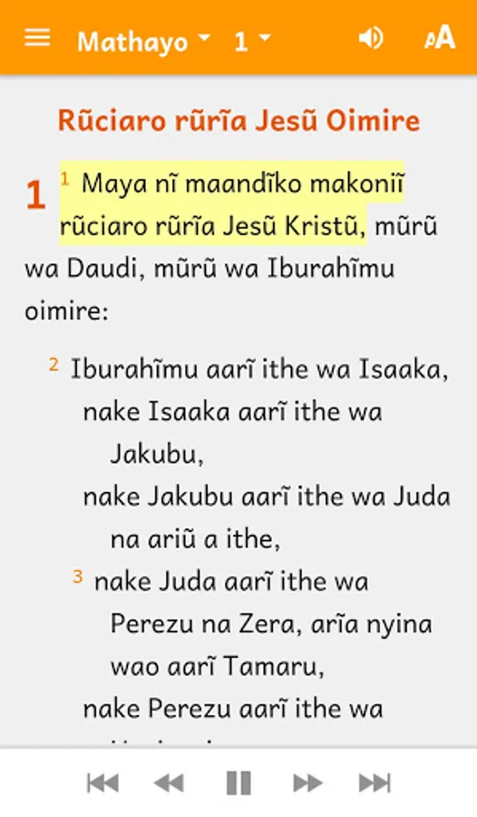 Read, listen and meditate on the Word of God in Kikuyu using our free Bible app. This Bible app supports almost all Android devices, so it is easy for you to download and use, at no cost to you. The Kikuyu Audio Bible has been integrated into our app so when you would like to listen to the audio, just press the "Speaker" icon from the app's menu bar. The audio has been synchronized with the text and highlights each verse like karaoke when you push play. You can also start listening anywhere within a chapter by tapping on the verse you want to hear.