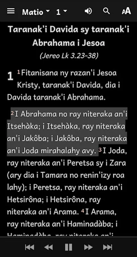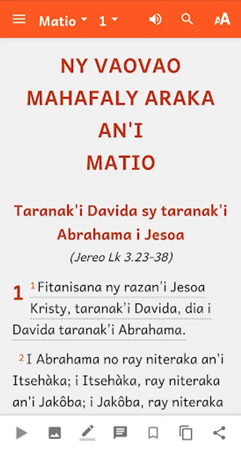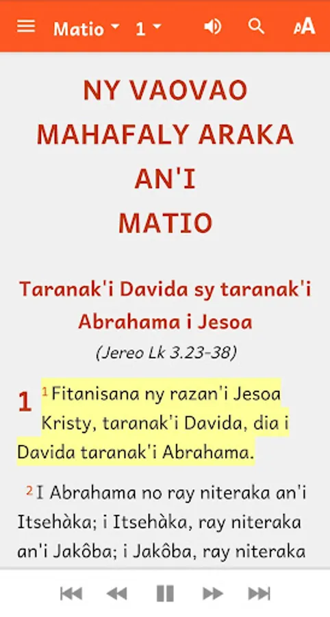 Read, listen and meditate on the Word of God in Malagasy using our free Bible app. It is easy for you to download and use, at no cost to you. The Malagasy Audio Bible by Faith Comes By Hearing has been integrated into our app so when you would like to listen to the audio, just press the "Speaker" icon from the app's menu bar. The audio has been synchronized with the text and highlights each verse like karaoke when you push play. You can also start listening anywhere within a chapter by tapping on the verse you want to hear.