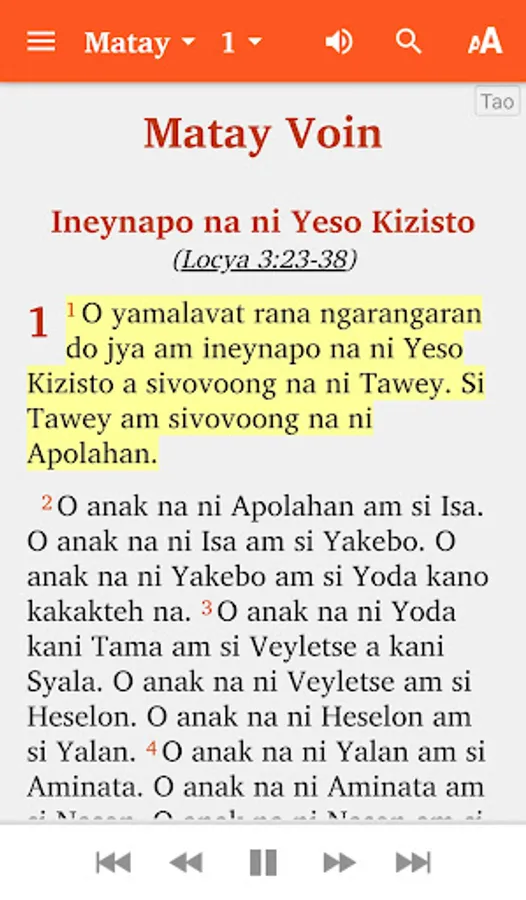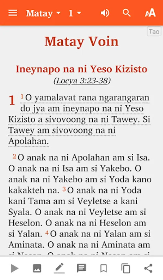 Read, listen and meditate on the Word of God in Tao using our free Bible app. It is easy for you to download and use, at no cost to you.