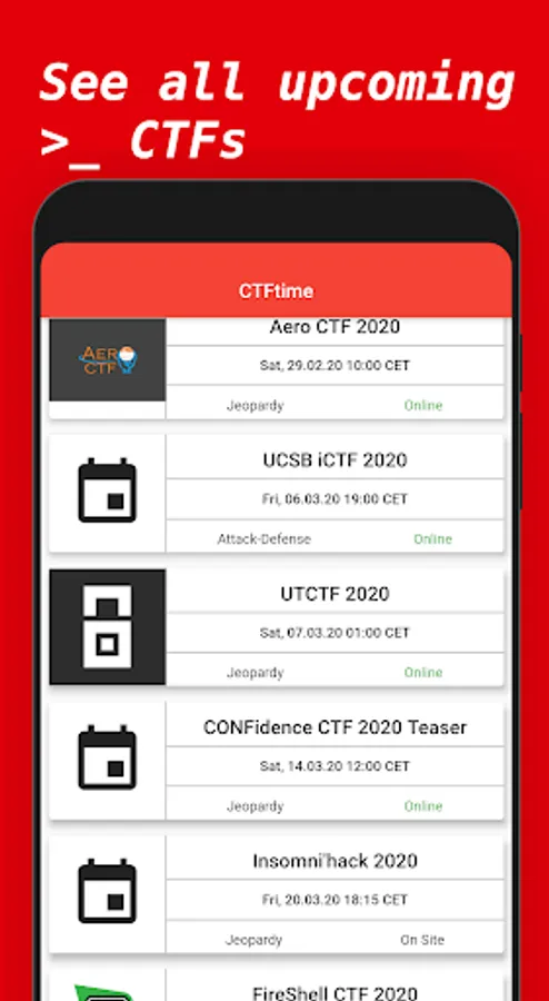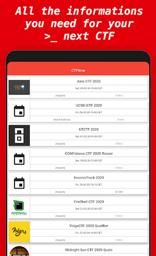 This is an app made for CTF Players to see upcoming events and keep track of these: