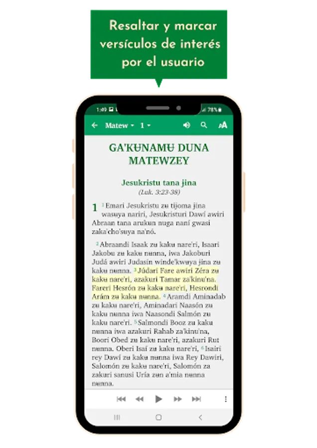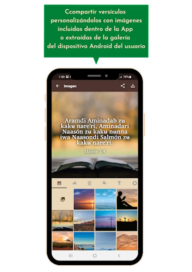 This application allows you to read, listen, search for keywords, underline, configure the font, text size, contrast to adapt the background color to light conditions, highlight and mark verses of interest to the user, and it also allows you to share verses Through social networks (WhatsApp, Instagram, Facebook), personalizing them with images included within the application or extracted from the gallery of the user's Android device.