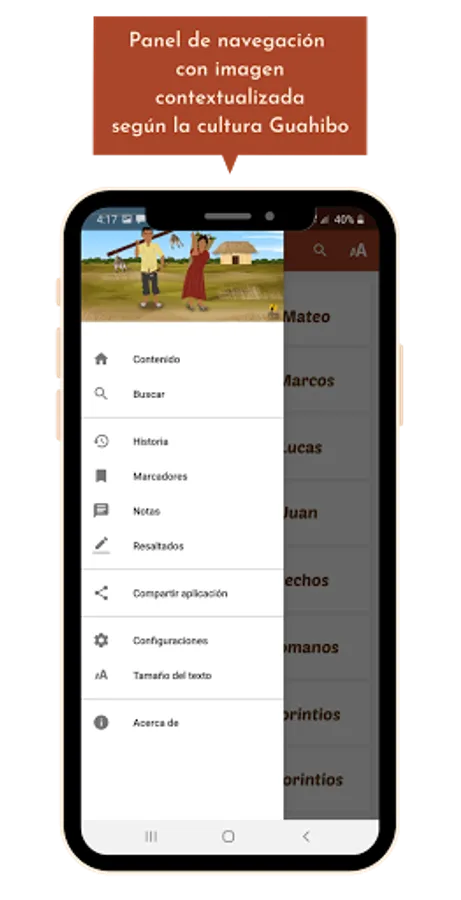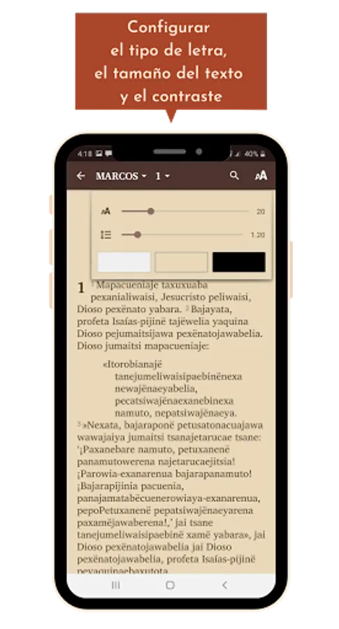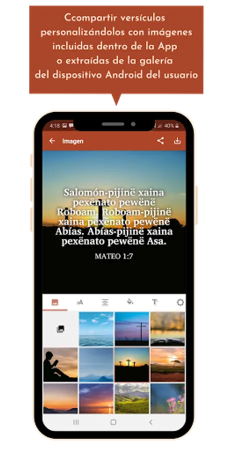 This application allows you to read, search for keywords, underline, configure the font, text size, contrast to adapt the background color to light conditions, highlight and mark verses of interest to the user, and it also allows you to share verses through of social networks (WhatsApp, Instagram, Facebook), personalizing them with images included within the application or extracted from the gallery of the user's Android device.