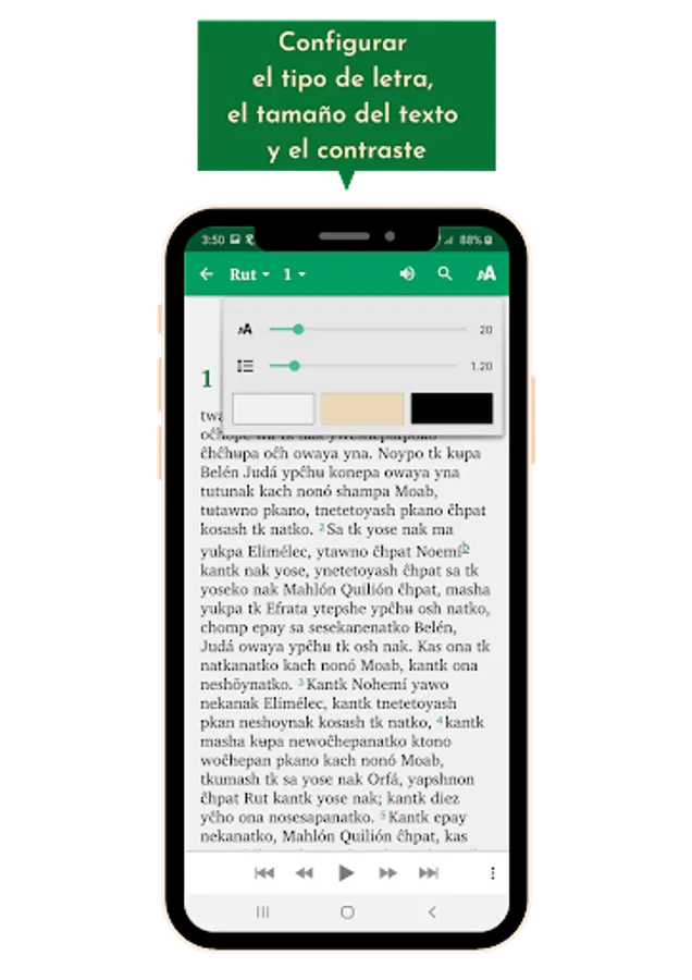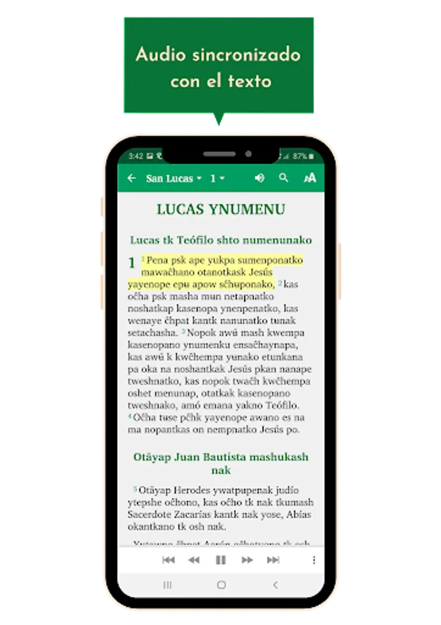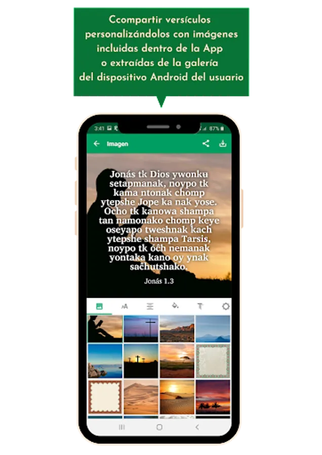 This application allows you to read, listen, search for keywords, underline, configure the font, text size, contrast to adapt the background color to light conditions, highlight and mark verses of interest to the user, and it also allows you to share verses Through social networks (WhatsApp, Instagram, Facebook), personalizing them with images included within the application or extracted from the gallery of the user's Android device.