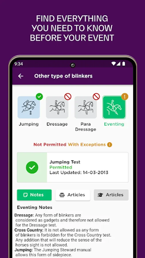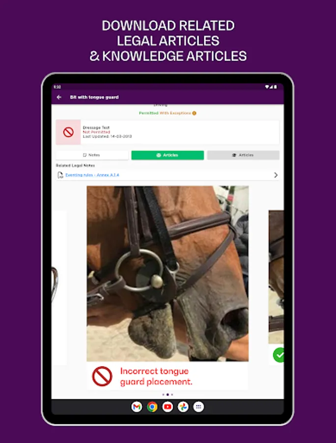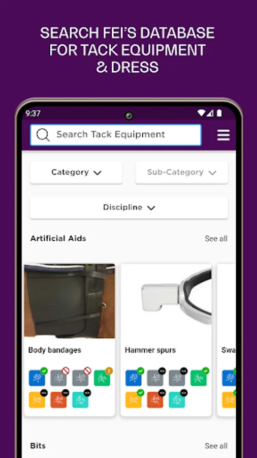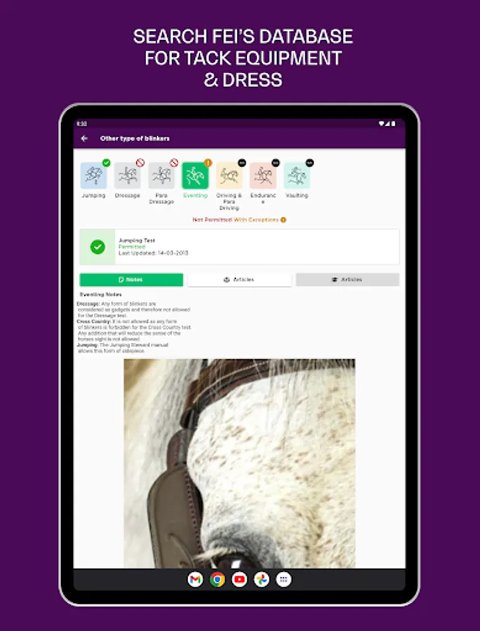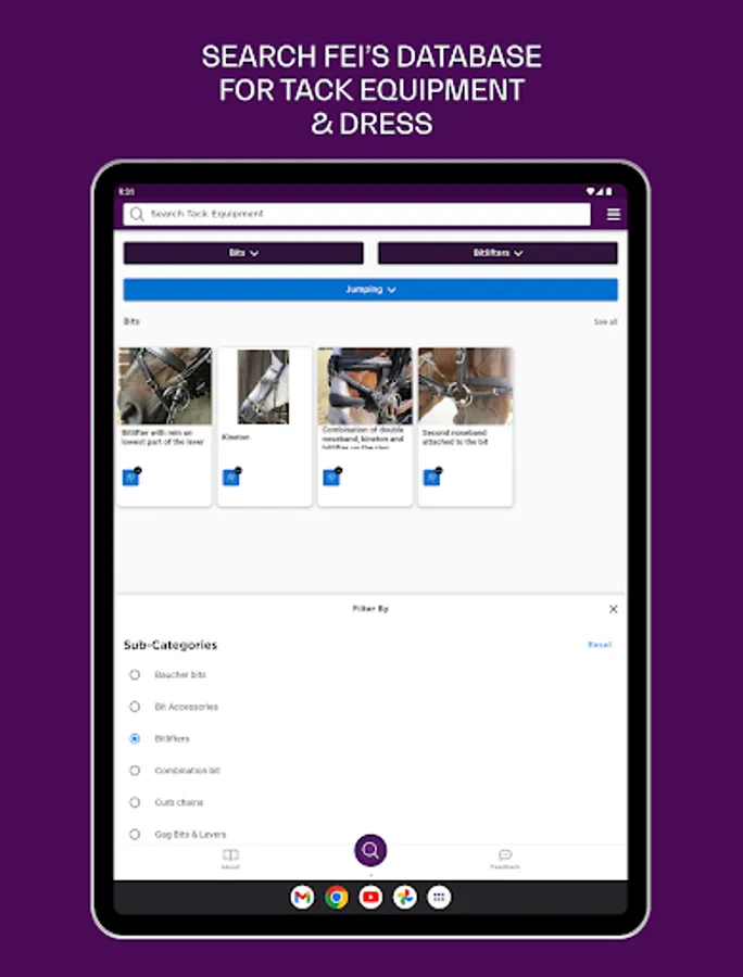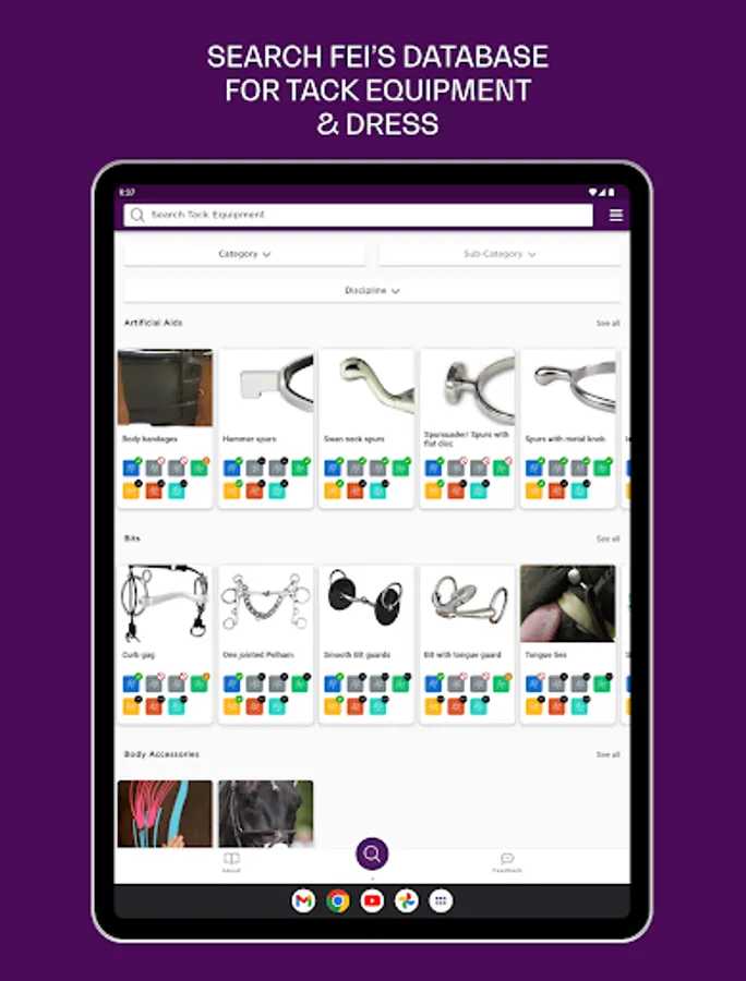 The FEI TackApp provides organised, easily understandable and searchable information on allowed and prohibited tack, equipment and dress at FEI Events.