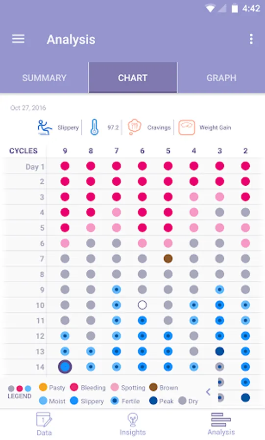 * Various view styles let you see and interpret your cycles better: calendar view, chart view and the detailed chart view, which let you see your symptoms.