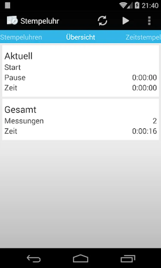 This app allows you to record your working hours in a simple and comfortable manner. The captured data can easily be exported as a CSV file and cause work with any spreadsheet program.