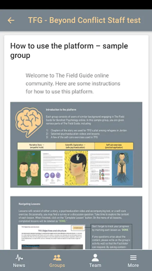 The Field Guide for Barefoot Psychology (TFG) is a psychosocial support and community mental health tool for those affected by conflict, disaster, and other traumas. TFG delivers accessible psychoeducation (scientific information) on a variety of relevant topics including stress, trauma, loss, shame, and resilience, along with practical self-care exercises ranging from yoga to mindfulness and dealing with intrusive thoughts. The content of the Field Guide was written by experts in the fields of neuroscience, psychology, and psychological trauma, in conjunction with conflict-affected communities.