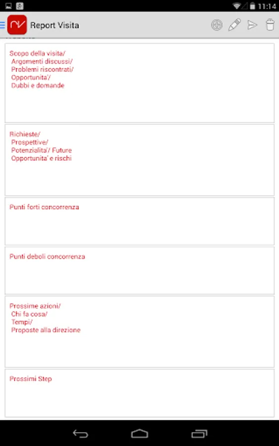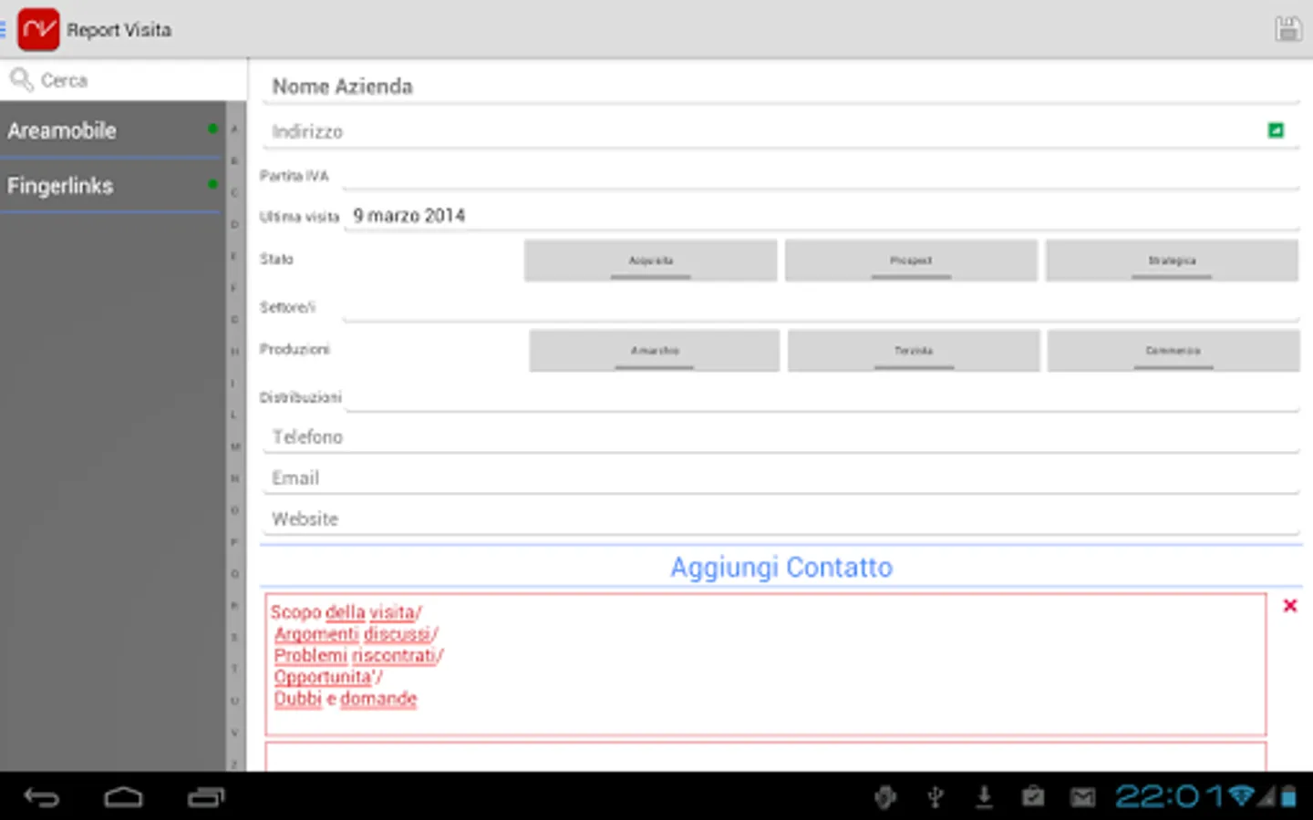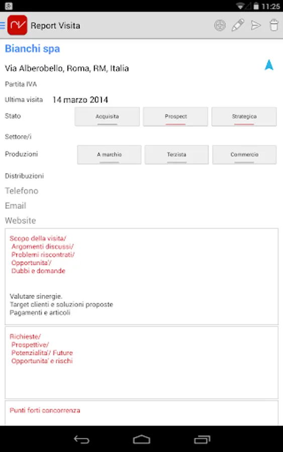 visit / Topics discussed / Problems encountered / Opportunities / Doubts and domandeRichieste /