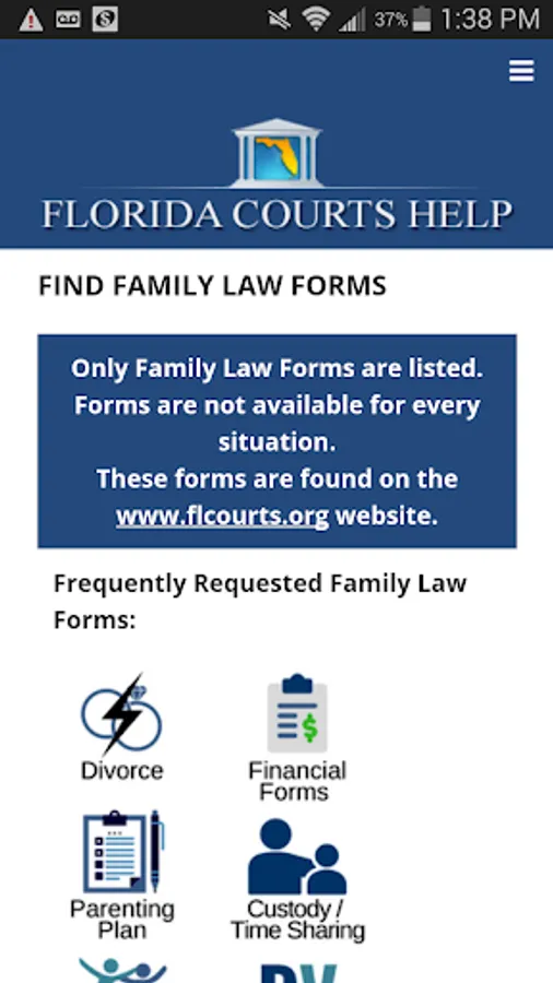 Florida Courts Help has access local self-help centers, free and low-cost legal aid, and family law forms. The forms are up-to-date, in ready-to-use format, with all amendments incorporated. All forms are provided free of charge by the Florida Supreme Court. Please note that the information provided in this self-help app is NOT legal advice and should not be considered as such. If you have a question about a specific issue, or do not understand the information presented, please contact an attorney.