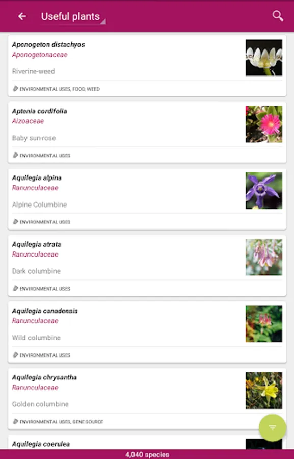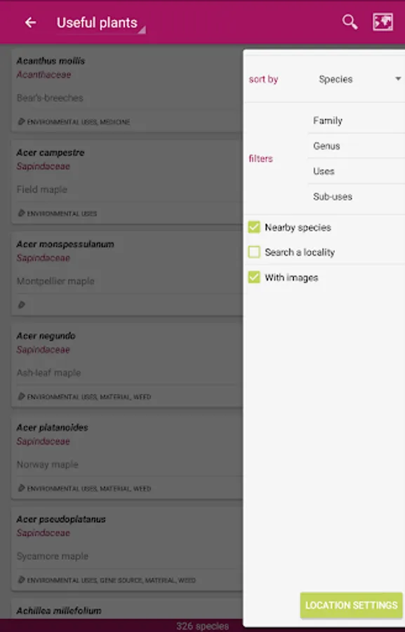 A browser offers the possibility to explore the species list and to filter according various criteria (your geographical position, plants uses, family, genus). Presently, there are four referentials that are availables within the application: French flora, Reunion Island flora, Useful plants, and World flora.