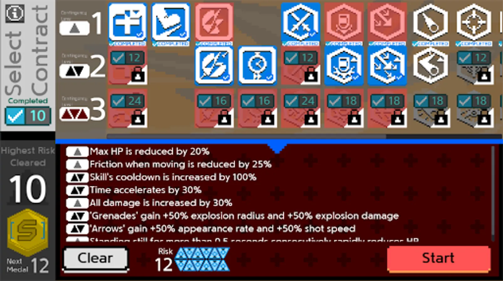 There's total 34 contracts that raise the difficulty level in various ways. Aim for the risk 18 medal!