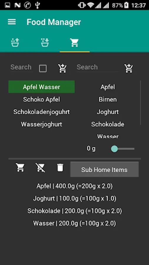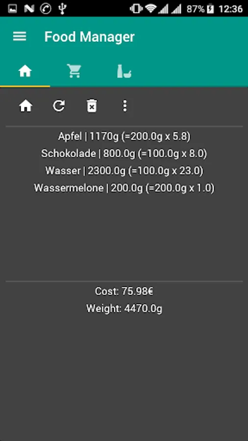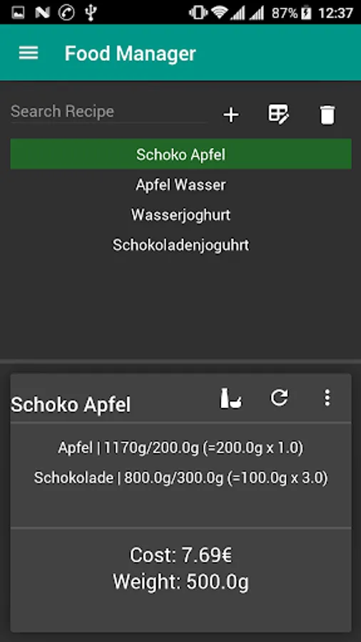 FoodManager let's you document your food items which you have at home. Based on these items you can define recipes and always know which recipes you can cook based on the items you have available. You get automatically statistics about the recipe for example how much it costs and weights.