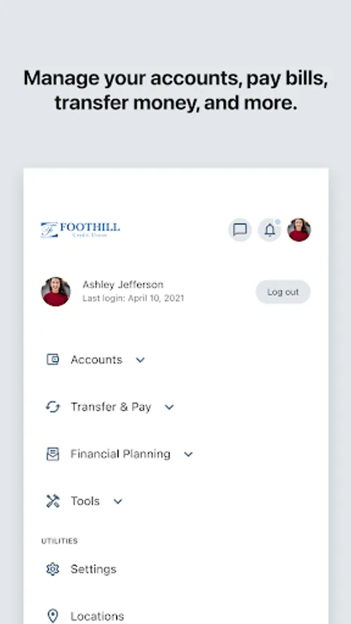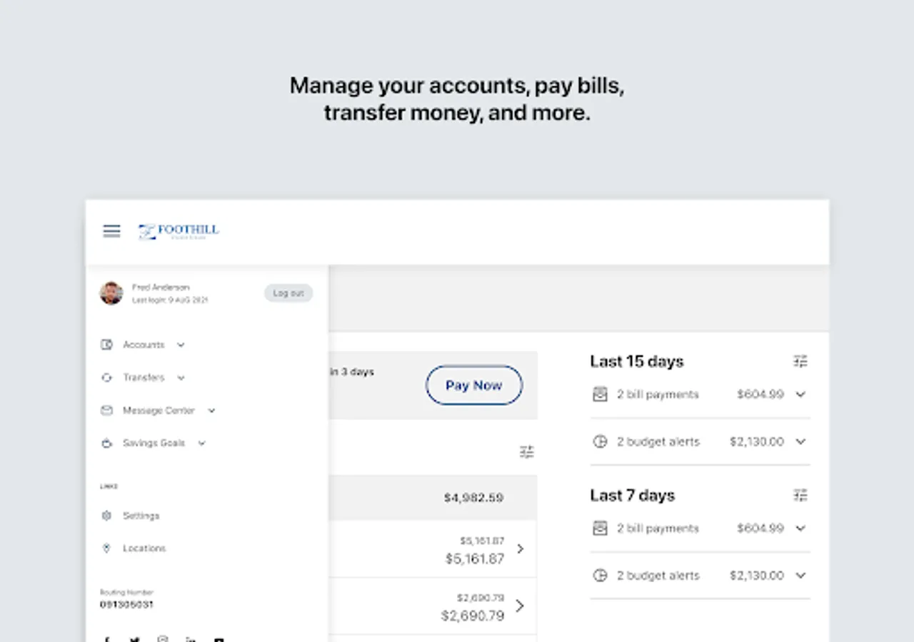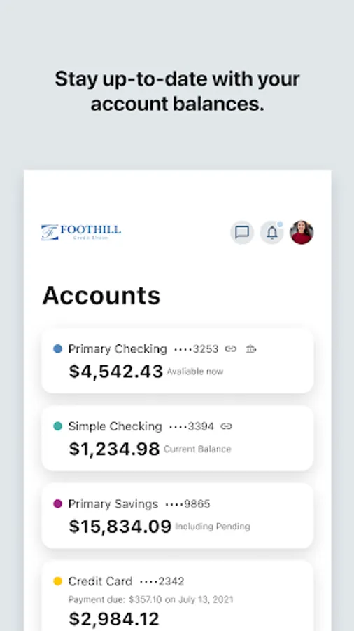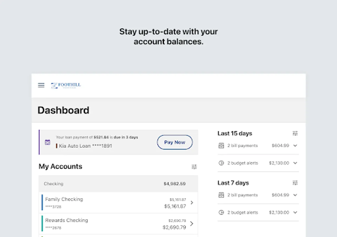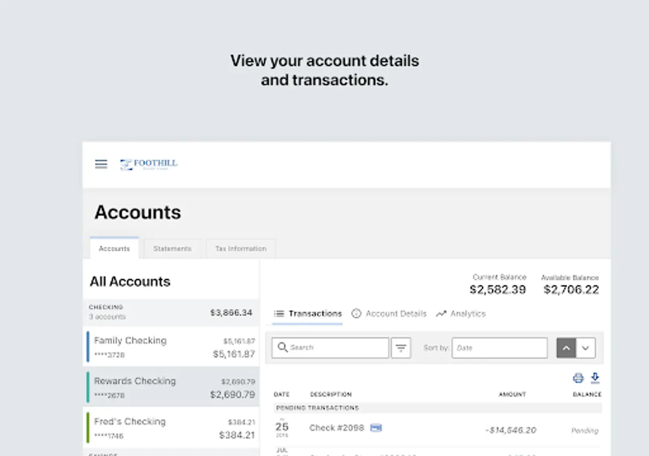 Foothill’s FREE* Mobile Banking app is convenient, secure and allows you to manage your money anytime, anywhere. All of your Foothill checking, savings and loan accounts can be viewed in one place. You can also pay bills, deposit checks, access your statement, make transfers to your accounts and much more all from the convenience of your mobile device.