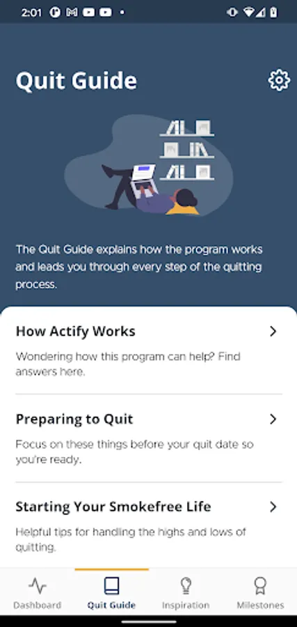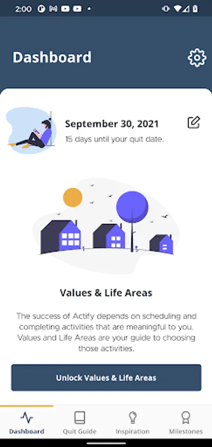 Actify App B uses an approach called Behavioral Activation Therapy to help you quit smoking. It helps you explore your personal values, teaches you about smoking triggers, helps you create and track your smoking cessation progress and your activities, and helps you manage your cravings. You will also receive notifications from the program providing helpful and encouraging information.