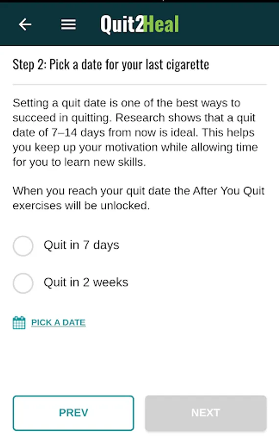Quit2Heal is a quit smoking app available to individuals who are a part of the Quit2Heal research study. The app provides tips on staying motivated to quit, coping with withdrawal and cravings, and preventing relapse.