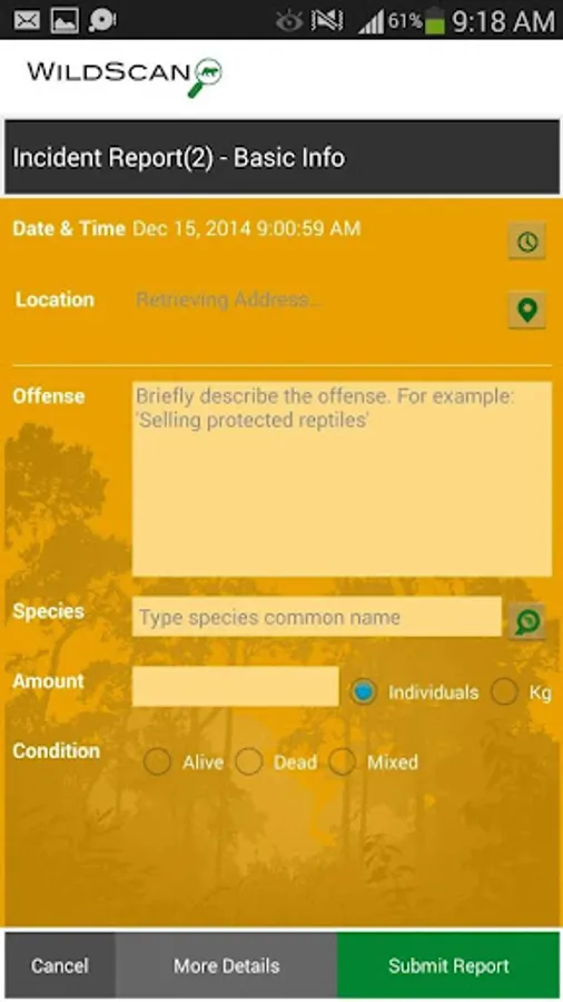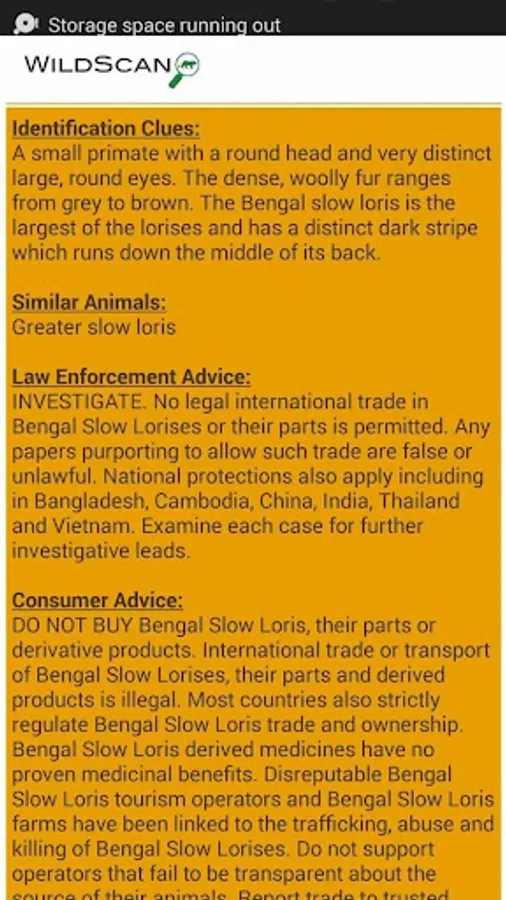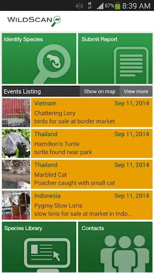 WildScan is a comprehensive species identification and response mobile application designed to combat wildlife trafficking. The application is designed to help front-line enforcement agencies, wildlife conservation officers, and the general public correctly identify, report and handle marine, freshwater and terrestrial animals caught in illegal wildlife trade. WildScan places critical information on endangered species at the fingertips of those who need it most and provides a tool to report wildlife crime. WildScan contains a comprehensive species library with more than 250 endangered animals commonly smuggled into and throughout Southeast Asia, a global hotspot for wildlife trafficking. The application will be available for free on Android devices with multiple platform and language support available in 2015.