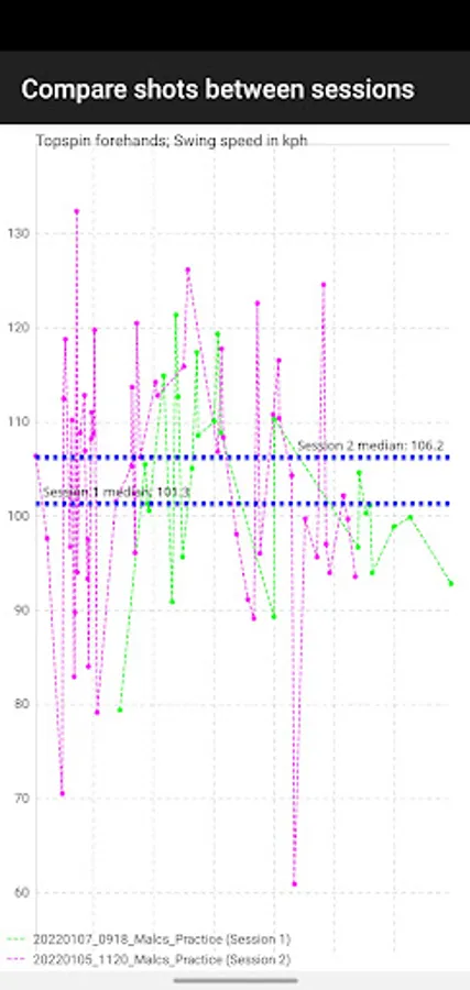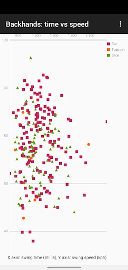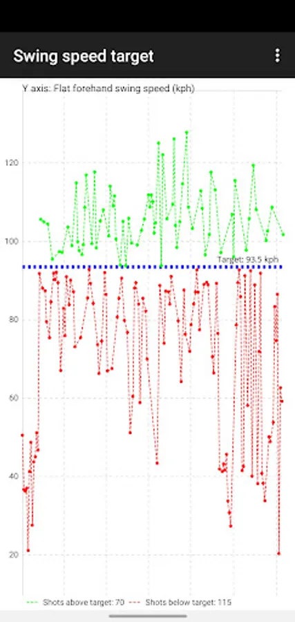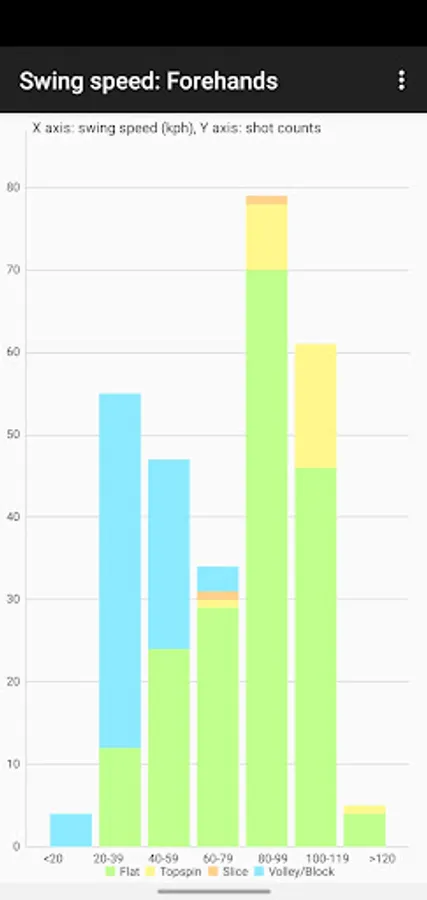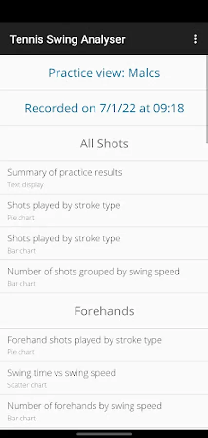 Tennis Swing Analyser can also be used in ‘practice mode’ where it will record every shot that you play during a practice or coaching session or while playing points and games. The results are sent to your phone and can be displayed graphically or exported to a spreadsheet for further analysis.