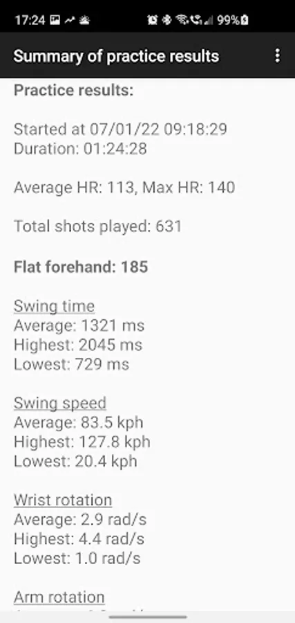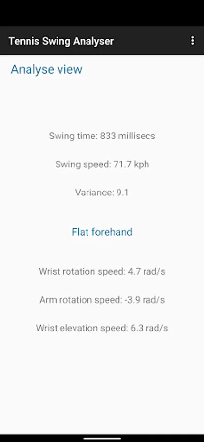 As the name implies, Tennis Swing Analyser is an app for analysing your tennis swing. The app uses the sensors in your Wear OS watch to recognise the tennis shots that you play, and can tell you the swing speed and swing time for each stroke. Optionally the app can also give you information about your wrist rotation, arm rotation and wrist elevation.