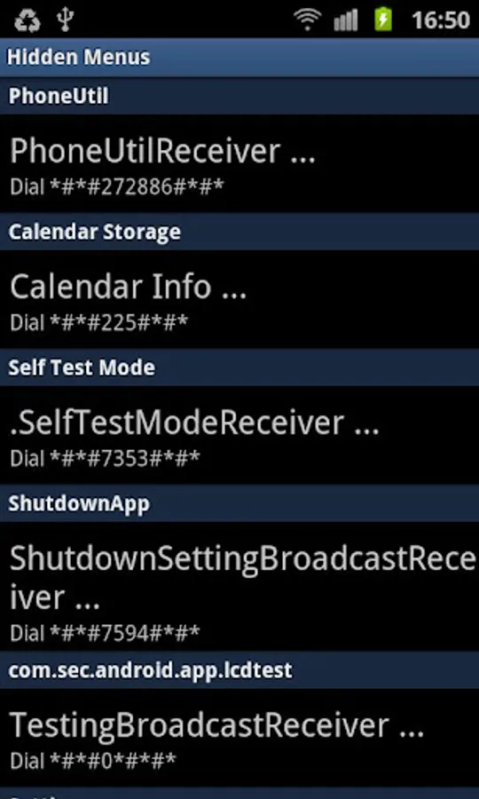 In the default Google AOSP Android, there is support for "secret dial codes". This is implemented in the Phone and Contacts applications where they look for numbers of the form "*#*#[secret code]#*#*". This program provides a simple user interface to list and activate this hidden functionality.