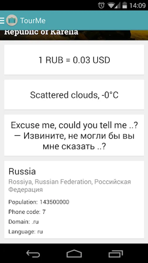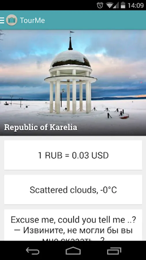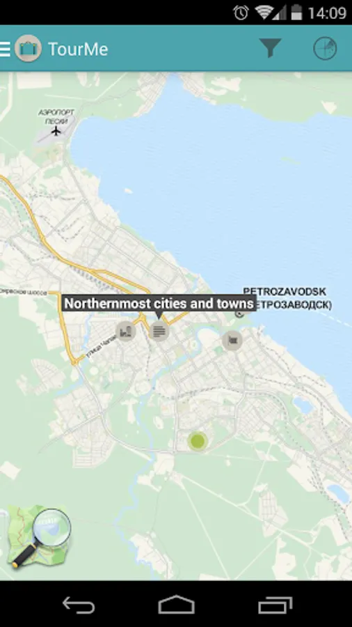 "TourMe" app, developed by PetrSU, enables tourists to search travel-related information without Internet connection, which might be unavailable or too expensive at the time of travel. Using the application, downloaded travel-related information, including maps, can be used during a trip to browse points of interest, read additional information and organize own story of the trip. After the trip these records can be uploaded to Internet for own needs and shared with friends via social networks. The application also provides ability to translate phrases into foreign language