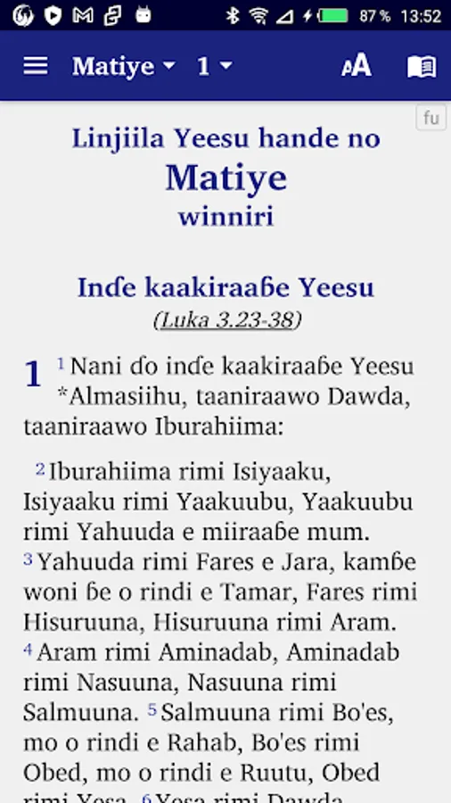 This application presents the New Testament translated into the Fulfulde Bakure or Fulfulde Borgu language spoken in northern Benin.