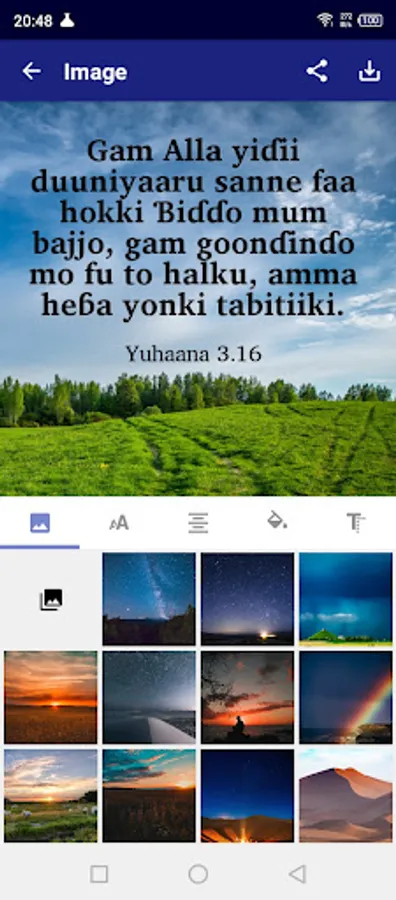 • When you tap on a verse, an image button is shown on the bottom toolbar. When this button is pressed, the ’Edit image’ screen appears. You can choose the background image, move the text around the image, change the font, text size, alignment, format and color. The finished image can be saved to the device and shared with others.