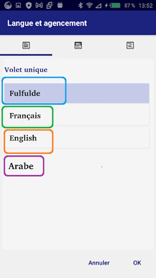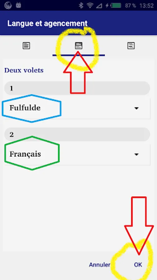- “two panes” to display the Fulfulde at the top and at the same time the French, English, or Arabic version at the bottom