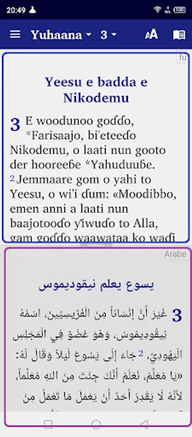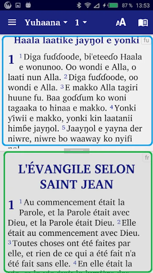 - "verse by verse" to display a verse in Fulfulde followed by the same verse in one of the other languages of your choice.