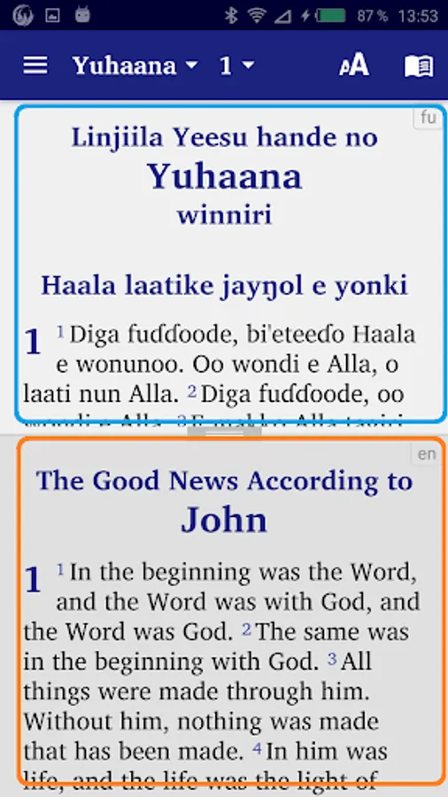 - “verse by verse” to display a verse in Fulfulde followed by the same verse in a language of your choice