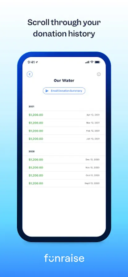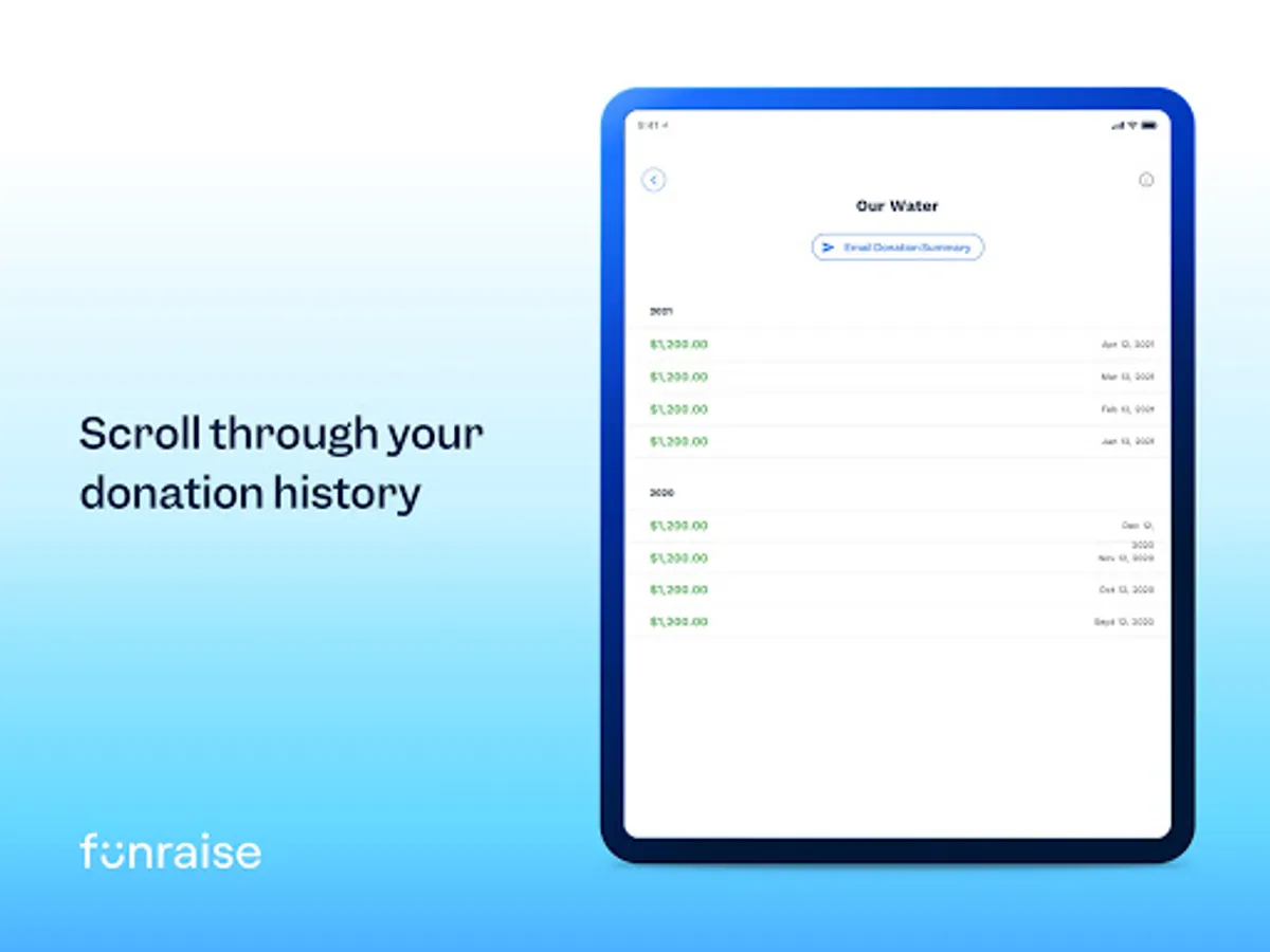 When you donate to a charity that uses Funraise’s platform, you have access to your donation data using the Giving by Funraise app. View a list of organizations you’ve donated to, as well as a list of donations for each organization.