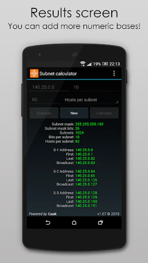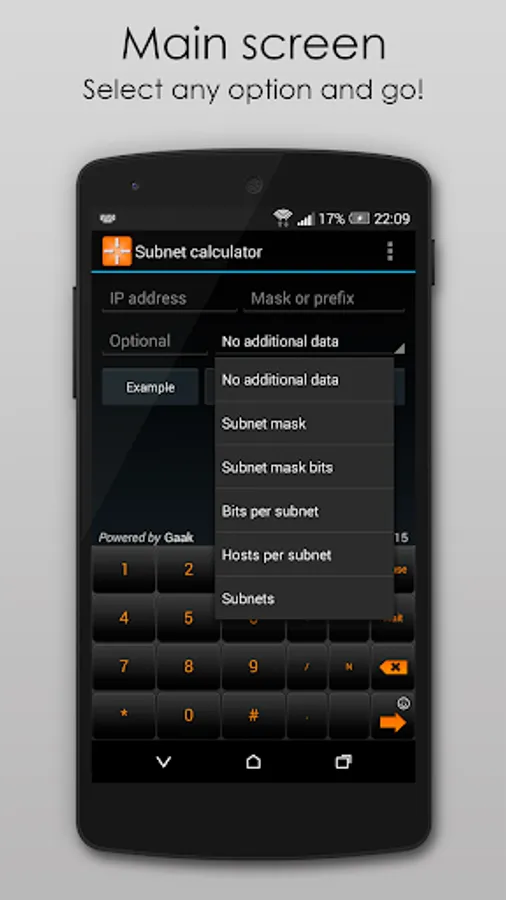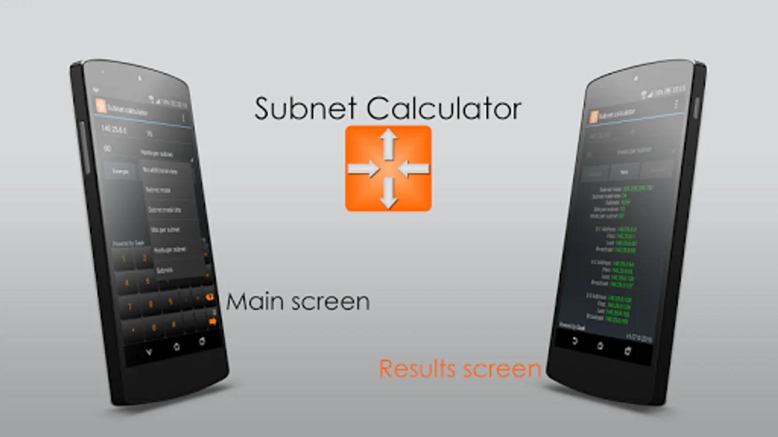 Solves any question by Subnet mask, Subnet mask bits, Bits per subnet, Hosts per subnet, Number of subnets. This app contains examples and shows network ranges and more information about.
