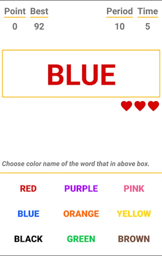 Choose color name of the word as correctly. Be careful, the word can belie you.