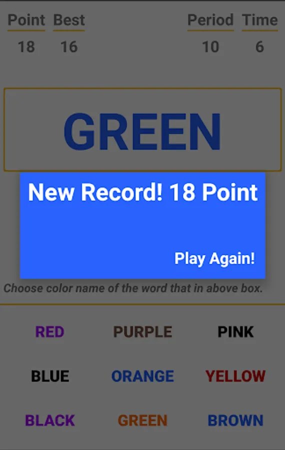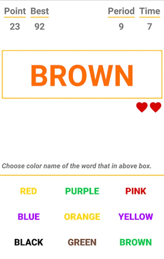 Left side of brain perceives meaning of words and choosing of color will be hard for it. After for awhile, color of word that in name of color list will change. But important is name of color, not just color. Try to choose correct name of color. Also don't forget the time. Have fun!