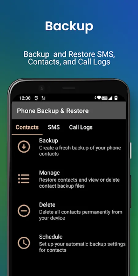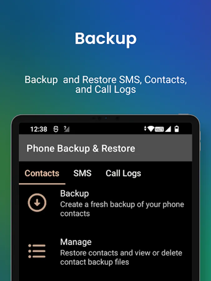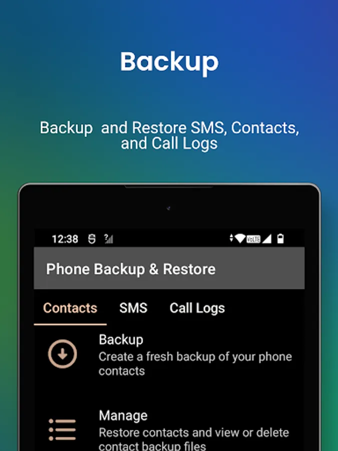 2. Backup Creation: Create backups of your contacts, SMS, and call logs, ensuring the safety of your data without any compromises.