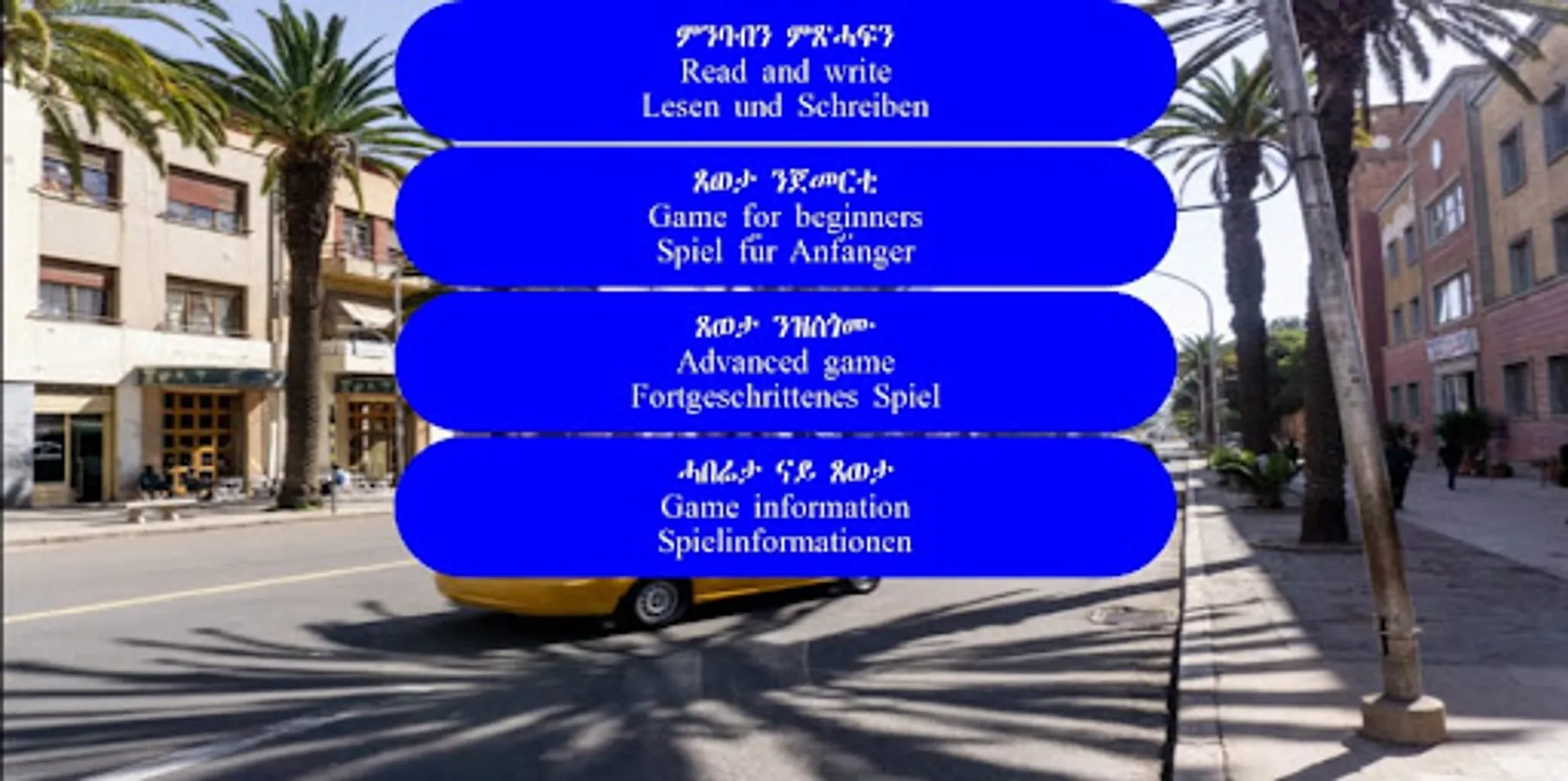 With the GameLearnTigrinyaAlphabet App, you will learn how to write and read the Tigrinya-Alphabet in a playful way. You will have fun playing but at the same time you will memorize the Tigrinya letters and learn what they look like and how to pronounce them. In addition, you will also learn how to form words and then assemble them into a sentence.