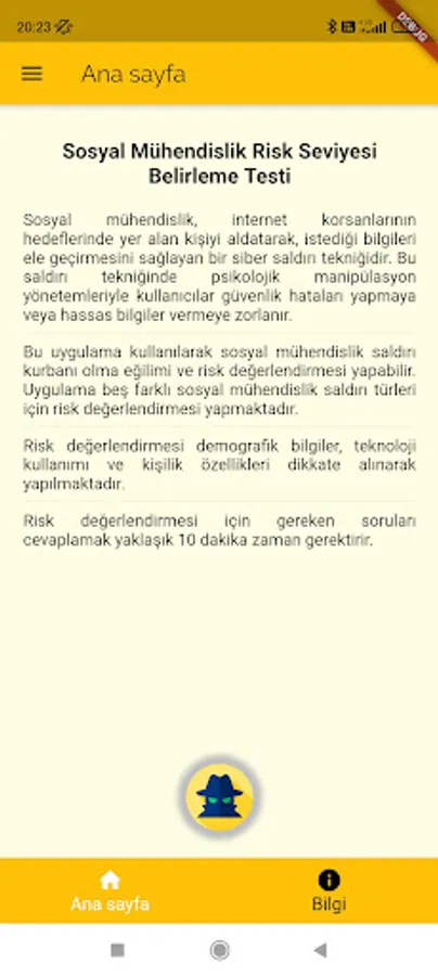 By using this app you can assess the propensity and risk of being a victim of social engineering attack. The application performs risk assessments for five different types of social engineering attacks.