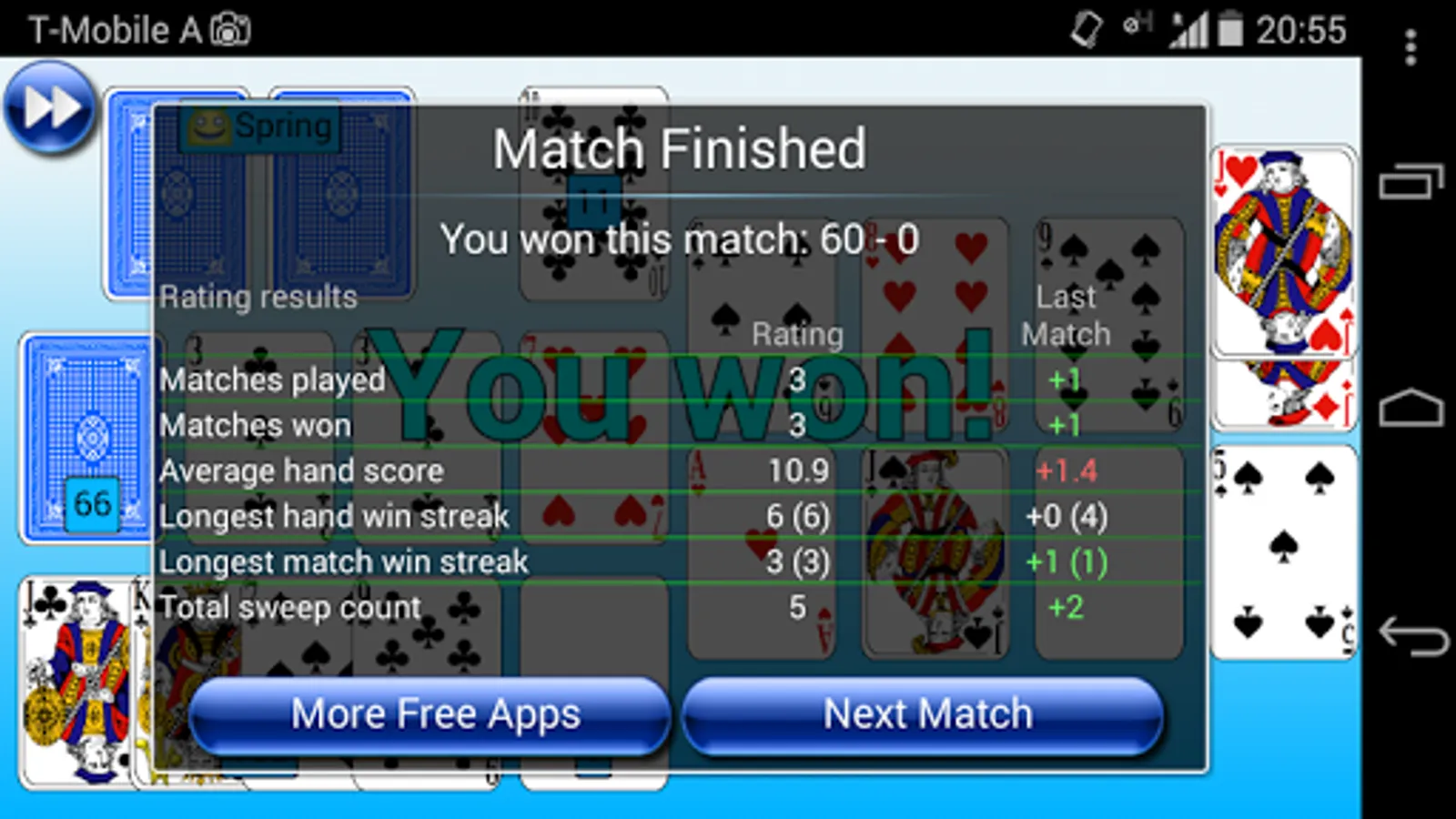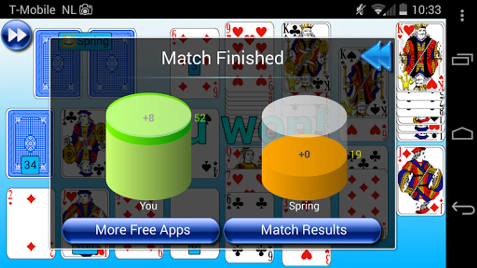The game ends when one player plays his/her last card from the pay-off pile onto one of the centre stacks.